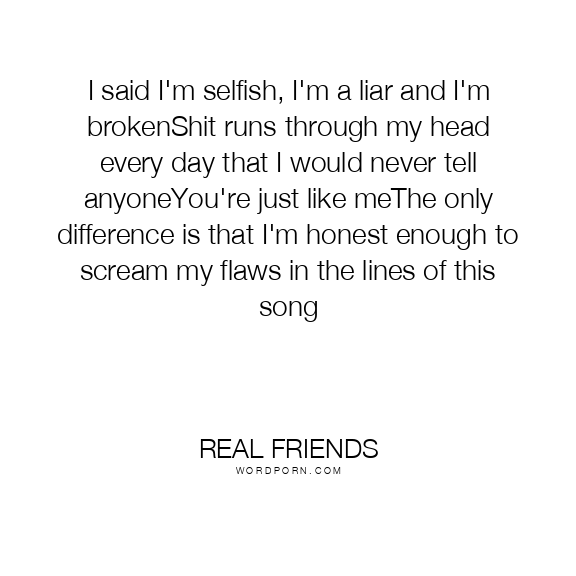 I said I'm selfish, I'm a liar and I'm brokenShit runs through my head every day that I would never tell anyoneYou're just like meThe only difference is that I'm honest enough to scream my flaws in the lines of this song