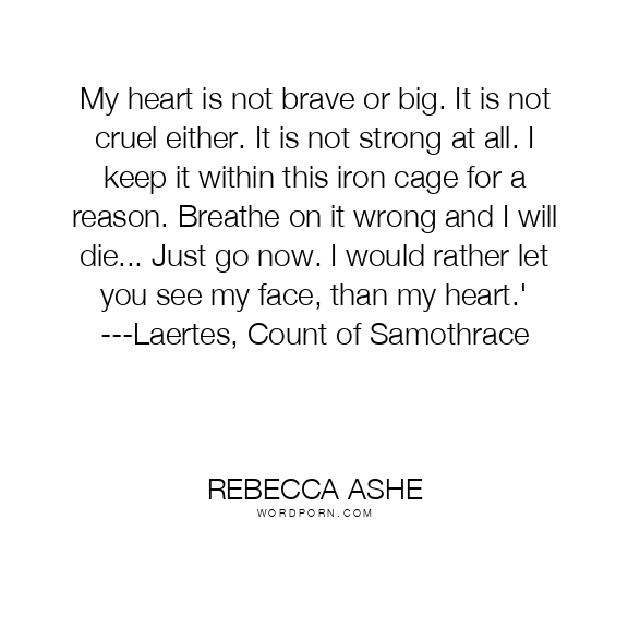 My heart is not brave or big. It is not cruel either. It is not strong at all. I keep it within this iron cage for a reason. Breathe on it wrong and I will die... Just go now. I would rather let you see my face, than my heart.' ---Laertes, Count of Samothrace