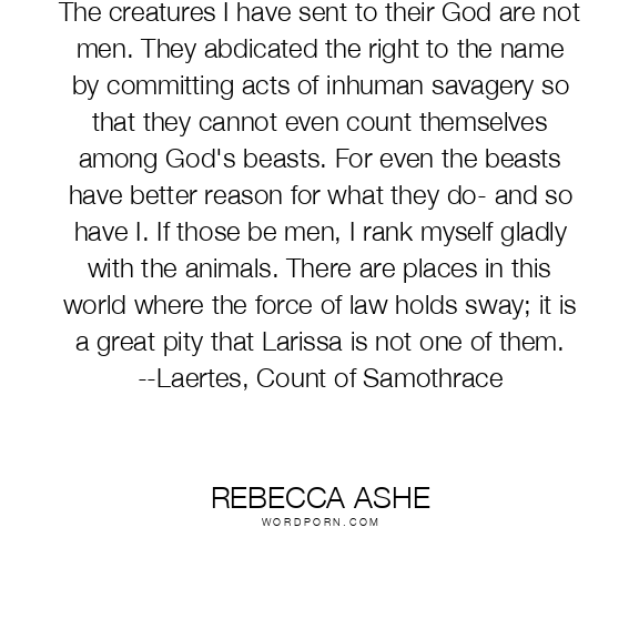 The creatures I have sent to their God are not men. They abdicated the right to the name by committing acts of inhuman savagery so that they cannot even count themselves among God's beasts. For even the beasts have better reason for what they do- and so have I. If those be men, I rank myself gladly with the animals. There are places in this world where the force of law holds sway; it is a great pity that Larissa is not one of them. --Laertes, Count of Samothrace