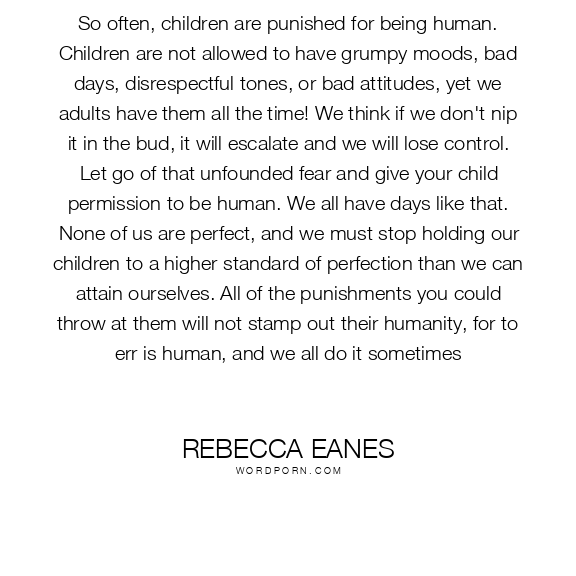 So often, children are punished for being human. Children are not allowed to have grumpy moods, bad days, disrespectful tones, or bad attitudes, yet we adults have them all the time! We think if we don't nip it in the bud, it will escalate and we will lose control. Let go of that unfounded fear and give your child permission to be human. We all have days like that. None of us are perfect, and we must stop holding our children to a higher standard of perfection than we can attain ourselves. All of the punishments you could throw at them will not stamp out their humanity, for to err is human, and we all do it sometimes