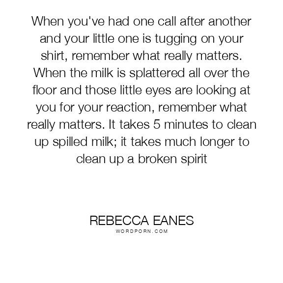 When you've had one call after another and your little one is tugging on your shirt, remember what really matters. When the milk is splattered all over the floor and those little eyes are looking at you for your reaction, remember what really matters. It takes 5 minutes to clean up spilled milk; it takes much longer to clean up a broken spirit