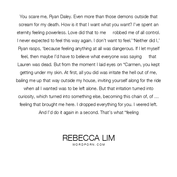 You scare me, Ryan Daley. Even more than those demons outside that scream for my death. How is it that I want what you want? I’ve spent an eternity feeling powerless. Love did that to me — robbed me of all control. I never expected to feel this way again. I don’t want to feel.’‘Neither did I,’ Ryan rasps, ‘because feeling anything at all was dangerous. If I let myself feel, then maybe I’d have to believe what everyone was saying — that Lauren was dead. But from the moment I laid eyes on “Carmen, you kept getting under my skin. At first, all you did was irritate the hell out of me, bailing me up that way outside my house, inviting yourself along for the ride when all I wanted was to be left alone. But that irritation turned into curiosity, which turned into something else, becoming this chain of, of … feeling that brought me here. I dropped everything for you. I veered left. And I’d do it again in a second. That’s what “feeling