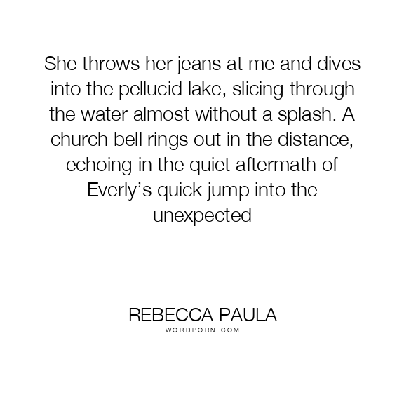 She throws her jeans at me and dives into the pellucid lake, slicing through the water almost without a splash. A church bell rings out in the distance, echoing in the quiet aftermath of Everly’s quick jump into the unexpected