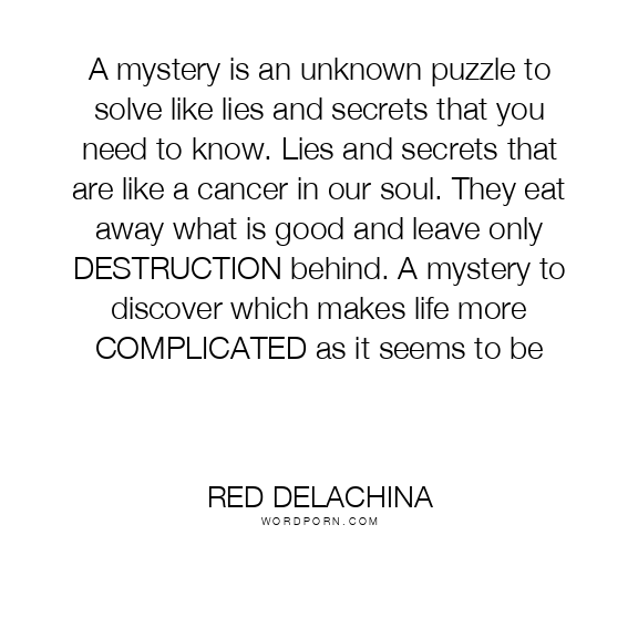 A mystery is an unknown puzzle to solve like lies and secrets that you need to know. Lies and secrets that are like a cancer in our soul. They eat away what is good and leave only DESTRUCTION behind. A mystery to discover which makes life more COMPLICATED as it seems to be