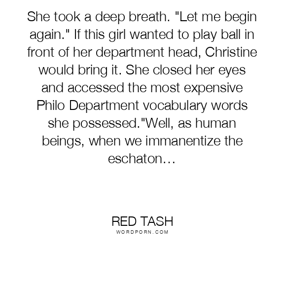 She took a deep breath. "Let me begin again." If this girl wanted to play ball in front of her department head, Christine would bring it. She closed her eyes and accessed the most expensive Philo Department vocabulary words she possessed."Well, as human beings, when we immanentize the eschaton…
