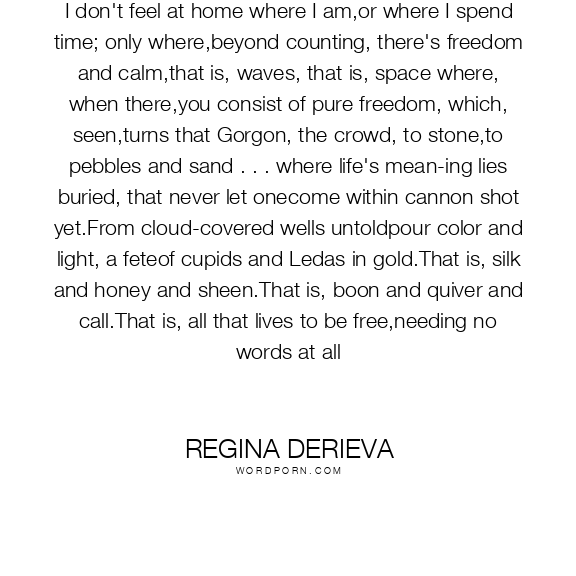 I don't feel at home where I am,or where I spend time; only where,beyond counting, there's freedom and calm,that is, waves, that is, space where, when there,you consist of pure freedom, which, seen,turns that Gorgon, the crowd, to stone,to pebbles and sand . . . where life's mean-ing lies buried, that never let onecome within cannon shot yet.From cloud-covered wells untoldpour color and light, a feteof cupids and Ledas in gold.That is, silk and honey and sheen.That is, boon and quiver and call.That is, all that lives to be free,needing no words at all
