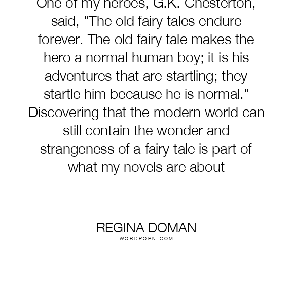 One of my heroes, G.K. Chesterton, said, "The old fairy tales endure forever. The old fairy tale makes the hero a normal human boy; it is his adventures that are startling; they startle him because he is normal." Discovering that the modern world can still contain the wonder and strangeness of a fairy tale is part of what my novels are about