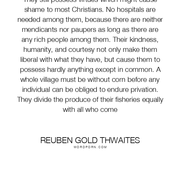 They still possess virtues which might cause shame to most Christians. No hospitals are needed among them, because there are neither mendicants nor paupers as long as there are any rich people among them. Their kindness, humanity, and courtesy not only make them liberal with what they have, but cause them to possess hardly anything except in common. A whole village must be without corn before any individual can be obliged to endure privation. They divide the produce of their fisheries equally with all who come