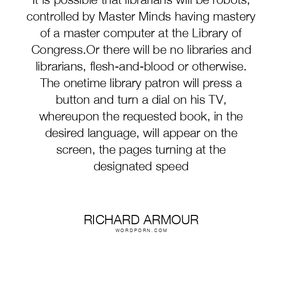 It is possible that librarians will be robots, controlled by Master Minds having mastery of a master computer at the Library of Congress.Or there will be no libraries and librarians, flesh-and-blood or otherwise. The onetime library patron will press a button and turn a dial on his TV, whereupon the requested book, in the desired language, will appear on the screen, the pages turning at the designated speed