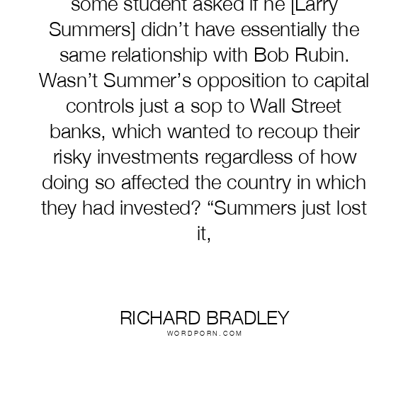 some student asked if he [Larry Summers] didn’t have essentially the same relationship with Bob Rubin. Wasn’t Summer’s opposition to capital controls just a sop to Wall Street banks, which wanted to recoup their risky investments regardless of how doing so affected the country in which they had invested? “Summers just lost it,
