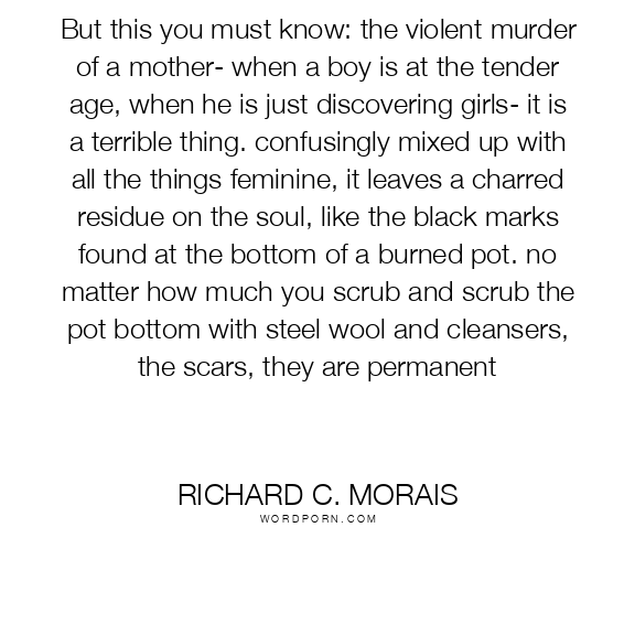 But this you must know: the violent murder of a mother- when a boy is at the tender age, when he is just discovering girls- it is a terrible thing. confusingly mixed up with all the things feminine, it leaves a charred residue on the soul, like the black marks found at the bottom of a burned pot. no matter how much you scrub and scrub the pot bottom with steel wool and cleansers, the scars, they are permanent