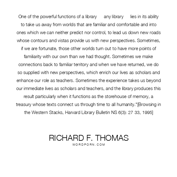 One of the powerful functions of a library — any library — lies in its ability to take us away from worlds that are familiar and comfortable and into ones which we can neither predict nor control, to lead us down new roads whose contours and vistas provide us with new perspectives. Sometimes, if we are fortunate, those other worlds turn out to have more points of familiarity with our own than we had thought. Sometimes we make connections back to familiar territory and when we have returned, we do so supplied with new perspectives, which enrich our lives as scholars and enhance our role as teachers. Sometimes the experience takes us beyond our immediate lives as scholars and teachers, and the library produces this result particularly when it functions as the storehouse of memory, a treasury whose texts connect us through time to all humanity."[Browsing in the Western Stacks, Harvard Library Bulletin NS 6(3): 27-33, 1995]