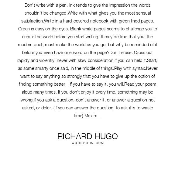 Don’t write with a pen. Ink tends to give the impression the words shouldn’t be changed.Write with what gives you the most sensual satisfaction.Write in a hard-covered notebook with green lined pages. Green is easy on the eyes. Blank white pages seems to challenge you to create the world before you start writing. It may be true that you, the modern poet, must make the world as you go, but why be reminded of it before you even have one word on the page?Don’t erase. Cross out rapidly and violently, never with slow consideration if you can help it.Start, as some smarty once said, in the middle of things.Play with syntax.Never want to say anything so strongly that you have to give up the option of finding something better – if you have to say it, you will.Read your poem aloud many times. If you don’t enjoy it every time, something may be wrong.If you ask a question, don’t answer it, or answer a question not asked, or defer. (If you can answer the question, to ask it is to waste time).Maximum sentence length: seventeen words.Minimum: One.Don’t be afraid to take emotional possession of words. If you don’t love a few words enough to own them, you will have to be very clever to write a good poem
