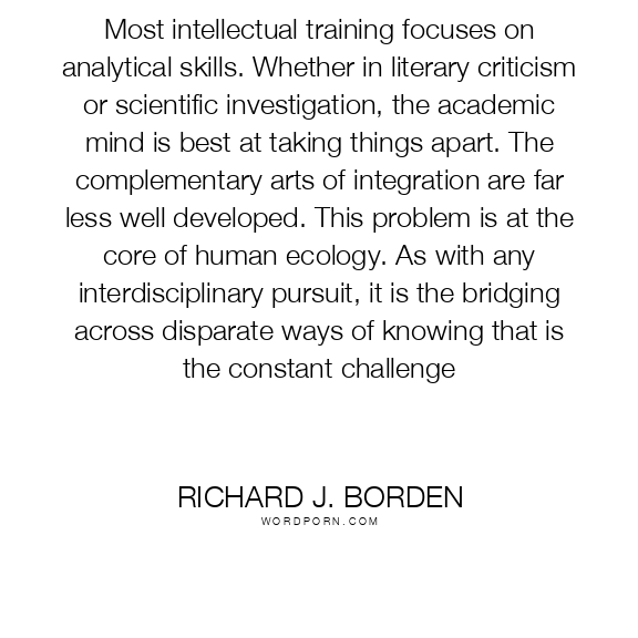Most intellectual training focuses on analytical skills. Whether in literary criticism or scientific investigation, the academic mind is best at taking things apart. The complementary arts of integration are far less well developed. This problem is at the core of human ecology. As with any interdisciplinary pursuit, it is the bridging across disparate ways of knowing that is the constant challenge