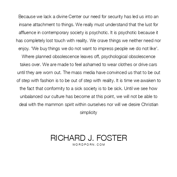Because we lack a divine Center our need for security has led us into an insane attachment to things. We really must understand that the lust for affluence in contemporary society is psychotic. It is psychotic because it has completely lost touch with reality. We crave things we neither need nor enjoy. 'We buy things we do not want to impress people we do not like'. Where planned obsolescence leaves off, psychological obsolescence takes over. We are made to feel ashamed to wear clothes or drive cars until they are worn out. The mass media have convinced us that to be out of step with fashion is to be out of step with reality. It is time we awaken to the fact that conformity to a sick society is to be sick. Until we see how unbalanced our culture has become at this point, we will not be able to deal with the mammon spirit within ourselves nor will we desire Christian simplicity