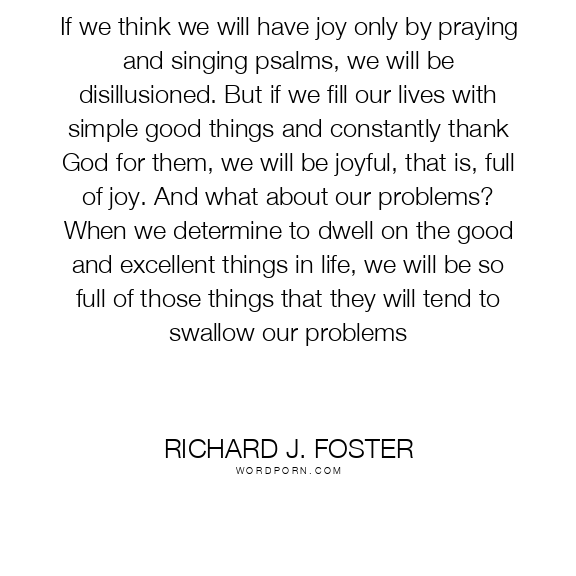 If we think we will have joy only by praying and singing psalms, we will be disillusioned. But if we fill our lives with simple good things and constantly thank God for them, we will be joyful, that is, full of joy. And what about our problems? When we determine to dwell on the good and excellent things in life, we will be so full of those things that they will tend to swallow our problems