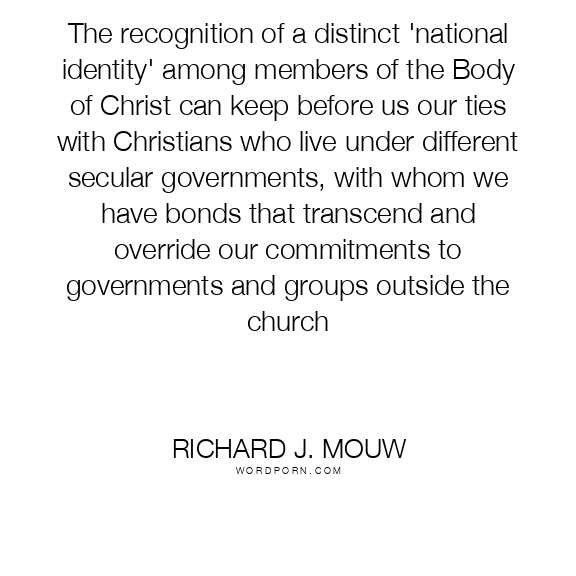 The recognition of a distinct 'national identity' among members of the Body of Christ can keep before us our ties with Christians who live under different secular governments, with whom we have bonds that transcend and override our commitments to governments and groups outside the church