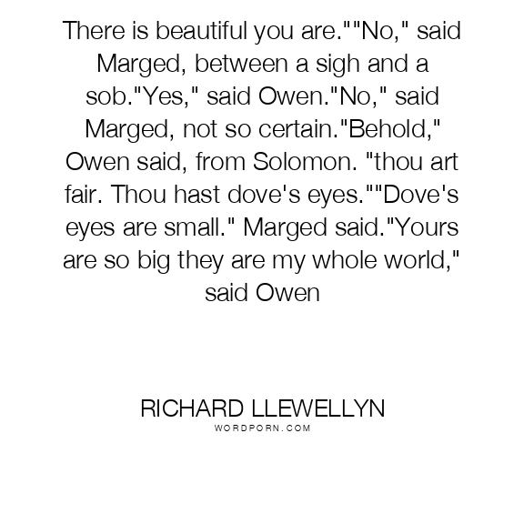 There is beautiful you are.""No," said Marged, between a sigh and a sob."Yes," said Owen."No," said Marged, not so certain."Behold," Owen said, from Solomon. "thou art fair. Thou hast dove's eyes.""Dove's eyes are small." Marged said."Yours are so big they are my whole world," said Owen