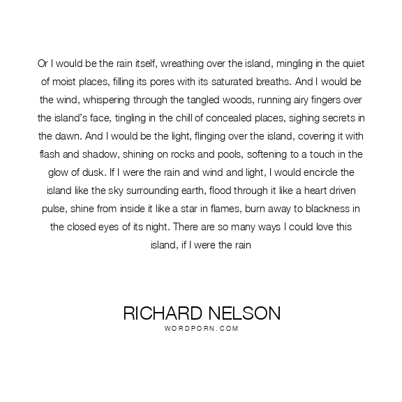 Or I would be the rain itself, wreathing over the island, mingling in the quiet of moist places, filling its pores with its saturated breaths. And I would be the wind, whispering through the tangled woods, running airy fingers over the island’s face, tingling in the chill of concealed places, sighing secrets in the dawn. And I would be the light, flinging over the island, covering it with flash and shadow, shining on rocks and pools, softening to a touch in the glow of dusk. If I were the rain and wind and light, I would encircle the island like the sky surrounding earth, flood through it like a heart driven pulse, shine from inside it like a star in flames, burn away to blackness in the closed eyes of its night. There are so many ways I could love this island, if I were the rain