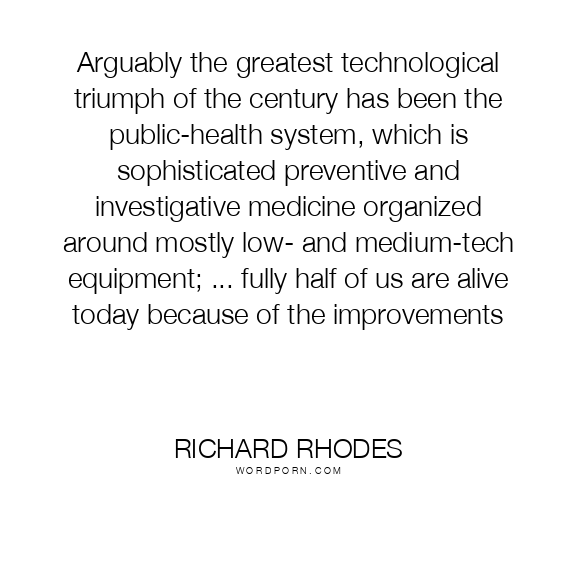 Arguably the greatest technological triumph of the century has been the public-health system, which is sophisticated preventive and investigative medicine organized around mostly low- and medium-tech equipment; ... fully half of us are alive today because of the improvements