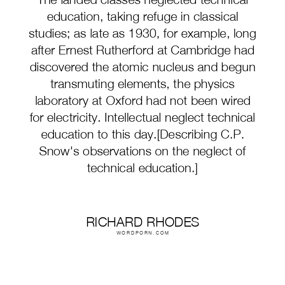 The landed classes neglected technical education, taking refuge in classical studies; as late as 1930, for example, long after Ernest Rutherford at Cambridge had discovered the atomic nucleus and begun transmuting elements, the physics laboratory at Oxford had not been wired for electricity. Intellectual neglect technical education to this day.[Describing C.P. Snow's observations on the neglect of technical education.]