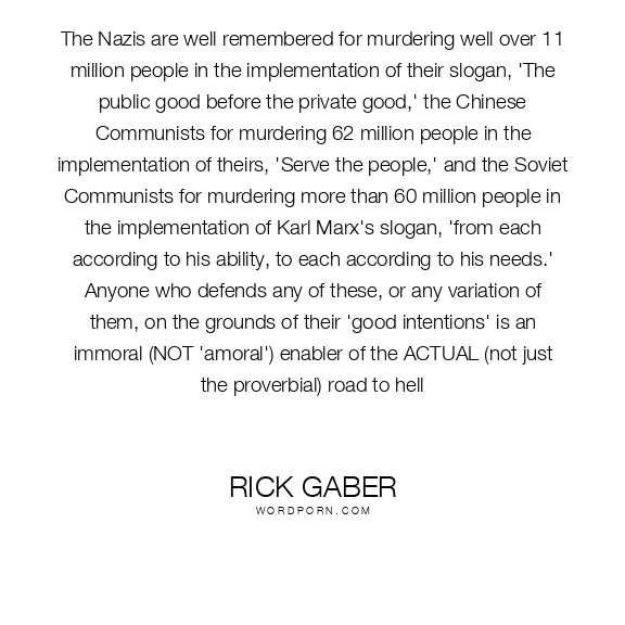 The Nazis are well remembered for murdering well over 11 million people in the implementation of their slogan, 'The public good before the private good,' the Chinese Communists for murdering 62 million people in the implementation of theirs, 'Serve the people,' and the Soviet Communists for murdering more than 60 million people in the implementation of Karl Marx's slogan, 'from each according to his ability, to each according to his needs.' Anyone who defends any of these, or any variation of them, on the grounds of their 'good intentions' is an immoral (NOT 'amoral') enabler of the ACTUAL (not just the proverbial) road to hell