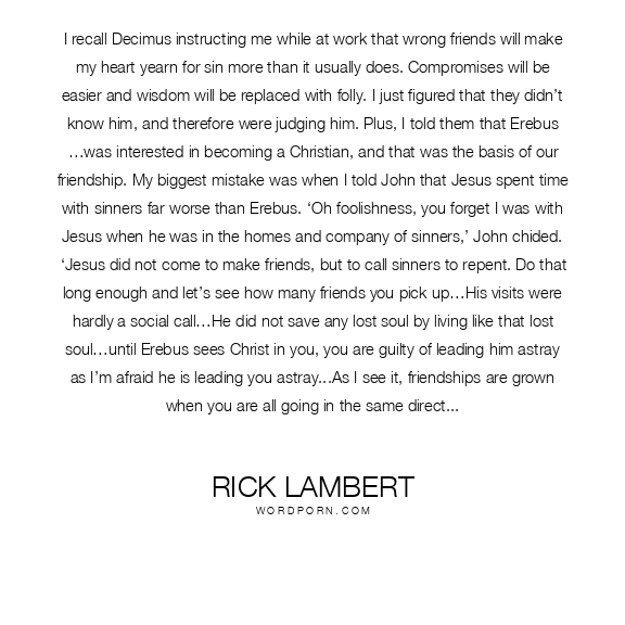 I recall Decimus instructing me while at work that wrong friends will make my heart yearn for sin more than it usually does. Compromises will be easier and wisdom will be replaced with folly. I just figured that they didn’t know him, and therefore were judging him. Plus, I told them that Erebus …was interested in becoming a Christian, and that was the basis of our friendship. My biggest mistake was when I told John that Jesus spent time with sinners far worse than Erebus. ‘Oh foolishness, you forget I was with Jesus when he was in the homes and company of sinners,’ John chided. ‘Jesus did not come to make friends, but to call sinners to repent. Do that long enough and let’s see how many friends you pick up…His visits were hardly a social call…He did not save any lost soul by living like that lost soul…until Erebus sees Christ in you, you are guilty of leading him astray as I’m afraid he is leading you astray...As I see it, friendships are grown when you are all going in the same direction, and can help, encourage and protect all involved. Friendships are not to be reckless, but constructive and purposeful where you are building each other up and improving each other’s character. If this isn’t that inner, guiding principle of all the friends you hold, then in what direction is it actually going, and what good will be derived from it? If friends are not making each other better, then they’re fulfilling the role of our spiritual enemy by tearing down what is good and ruining what had potential……