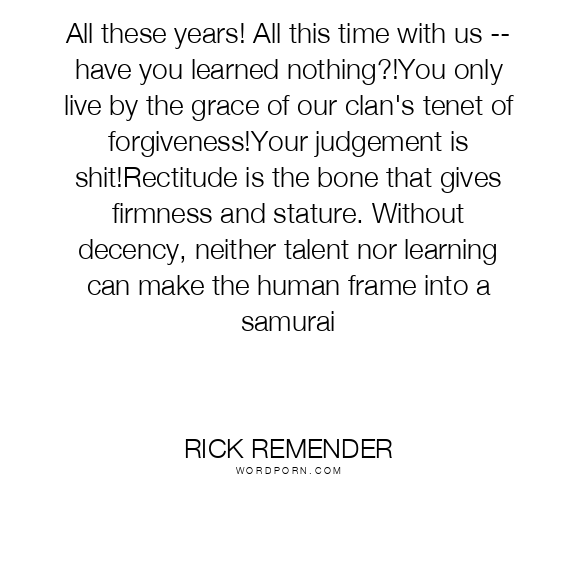 All these years! All this time with us -- have you learned nothing?!You only live by the grace of our clan's tenet of forgiveness!Your judgement is shit!Rectitude is the bone that gives firmness and stature. Without decency, neither talent nor learning can make the human frame into a samurai