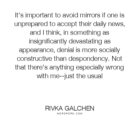 It's important to avoid mirrors if one is unprepared to accept their daily news, and I think, in something as insignificantly devastating as appearance, denial is more socially constructive than despondency. Not that there's anything especially wrong with me--just the usual