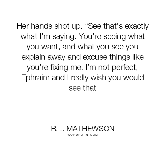 Her hands shot up. “See that’s exactly what I’m saying. You’re seeing what you want, and what you see you explain away and excuse things like you’re fixing me. I’m not perfect, Ephraim and I really wish you would see that
