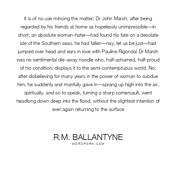 It is of no use mincing the matter; Dr John Marsh, after being regarded by his friends at home as hopelessly unimpressible—in short, an absolute woman-hater—had found his fate on a desolate isle of the Southern seas, he had fallen—nay, let us be just—had jumped over head and ears in love with Pauline Rigonda! Dr Marsh was no sentimental die-away noodle who, half-ashamed, half-proud of his condition, displays it to the semi-contemptuous world. No; after disbelieving for many years in the power of woman to subdue him, he suddenly and manfully gave in—sprang up high into the air, spiritually, and so to speak, turning a sharp somersault, went headlong down deep into the flood, without the slightest intention of ever again returning to the surface