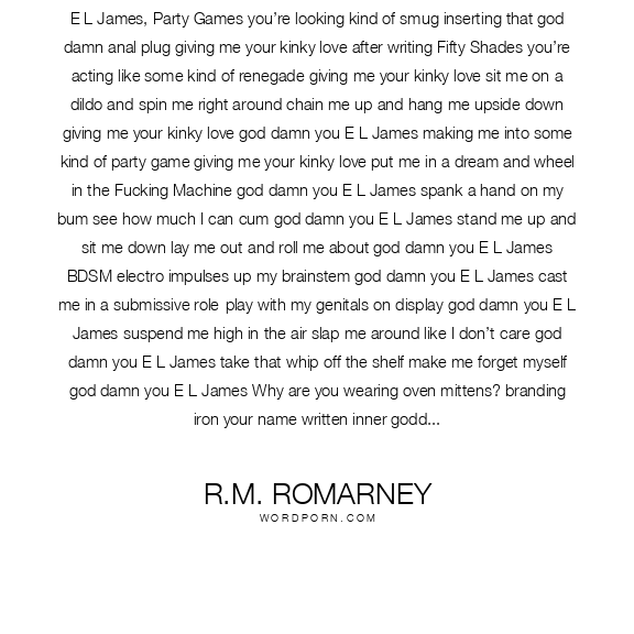 E L James, Party Games you’re looking kind of smug inserting that god damn anal plug giving me your kinky love after writing Fifty Shades you’re acting like some kind of renegade giving me your kinky love sit me on a dildo and spin me right around chain me up and hang me upside down giving me your kinky love god damn you E L James making me into some kind of party game giving me your kinky love put me in a dream and wheel in the Fucking Machine god damn you E L James spank a hand on my bum see how much I can cum god damn you E L James stand me up and sit me down lay me out and roll me about god damn you E L James BDSM electro impulses up my brainstem god damn you E L James cast me in a submissive role-play with my genitals on display god damn you E L James suspend me high in the air slap me around like I don’t care god damn you E L James take that whip off the shelf make me forget myself god damn you E L James Why are you wearing oven mittens? branding iron your name written inner goddess don’t keep in hidden god damn you E L James holy crap my mind has snapped to forget one thing that I have heard I’m never going to use the safe-word god damn you E L James By R.M.Romarney