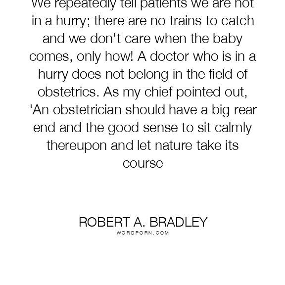 We repeatedly tell patients we are not in a hurry; there are no trains to catch and we don't care when the baby comes, only how! A doctor who is in a hurry does not belong in the field of obstetrics. As my chief pointed out, 'An obstetrician should have a big rear end and the good sense to sit calmly thereupon and let nature take its course