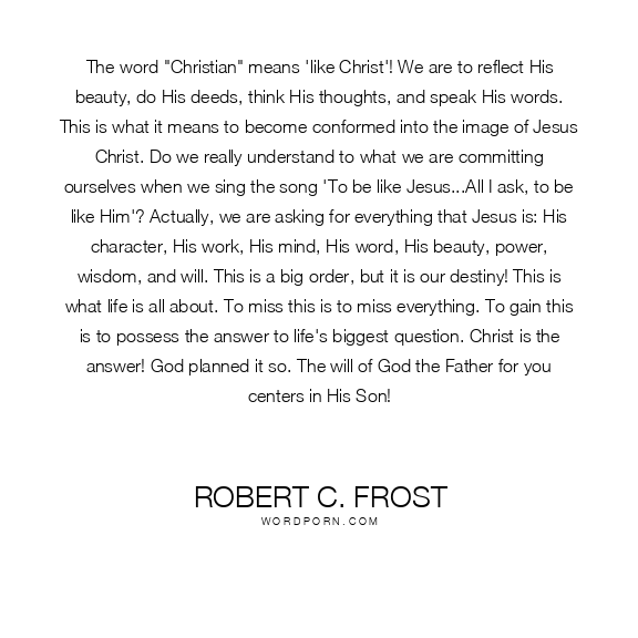 The word "Christian" means 'like Christ'! We are to reflect His beauty, do His deeds, think His thoughts, and speak His words. This is what it means to become conformed into the image of Jesus Christ. Do we really understand to what we are committing ourselves when we sing the song 'To be like Jesus...All I ask, to be like Him'? Actually, we are asking for everything that Jesus is: His character, His work, His mind, His word, His beauty, power, wisdom, and will. This is a big order, but it is our destiny! This is what life is all about. To miss this is to miss everything. To gain this is to possess the answer to life's biggest question. Christ is the answer! God planned it so. The will of God the Father for you centers in His Son!