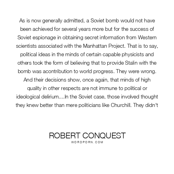 As is now generally admitted, a Soviet bomb would not have been achieved for several years more but for the success of Soviet espionage in obtaining secret information from Western scientists associated with the Manhattan Project. That is to say, political ideas in the minds of certain capable physicists and others took the form of believing that to provide Stalin with the bomb was acontribution to world progress. They were wrong. And their decisions show, once again, that minds of high quality in other respects are not immune to political or ideological delirium....In the Soviet case, those involved thought they knew better than mere politicians like Churchill. They didn't