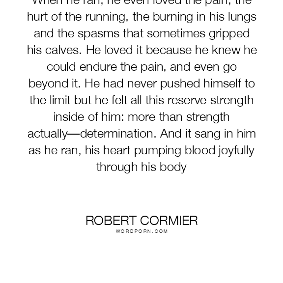 When he ran, he even loved the pain, the hurt of the running, the burning in his lungs and the spasms that sometimes gripped his calves. He loved it because he knew he could endure the pain, and even go beyond it. He had never pushed himself to the limit but he felt all this reserve strength inside of him: more than strength actually—determination. And it sang in him as he ran, his heart pumping blood joyfully through his body