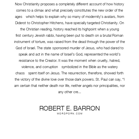 Now Christianity proposes a completely different account of how history comes to a climax and what precisely constitutes the new order of the ages—which helps to explain why so many of modernity’s avatars, from Diderot to Christopher Hitchens, have specially targeted Christianity. On the Christian reading, history reached its highpoint when a young first-century Jewish rabbi, having been put to death on a brutal Roman instrument of torture, was raised from the dead through the power of the God of Israel. The state-sponsored murder of Jesus, who had dared to speak and act in the name of Israel’s God, represented the world’s resistance to the Creator. It was the moment when cruelty, hatred, violence, and corruption—symbolized in the Bible as the watery chaos—spent itself on Jesus. The resurrection, therefore, showed forth the victory of the divine love over those dark powers. St. Paul can say, “I am certain that neither death nor life, neither angels nor principalities, nor any other creature can separate us from the love of God,