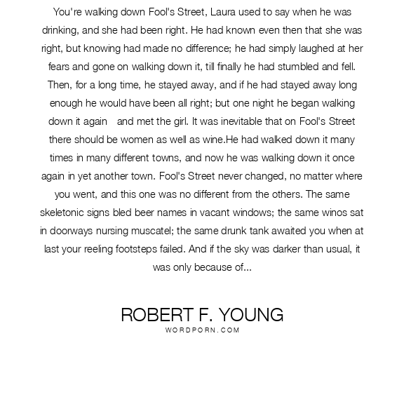 You're walking down Fool's Street, Laura used to say when he was drinking, and she had been right. He had known even then that she was right, but knowing had made no difference; he had simply laughed at her fears and gone on walking down it, till finally he had stumbled and fell. Then, for a long time, he stayed away, and if he had stayed away long enough he would have been all right; but one night he began walking down it again - and met the girl. It was inevitable that on Fool's Street there should be women as well as wine.He had walked down it many times in many different towns, and now he was walking down it once again in yet another town. Fool's Street never changed, no matter where you went, and this one was no different from the others. The same skeletonic signs bled beer names in vacant windows; the same winos sat in doorways nursing muscatel; the same drunk tank awaited you when at last your reeling footsteps failed. And if the sky was darker than usual, it was only because of the rain which had begun falling early that morning and been falling steadily ever since