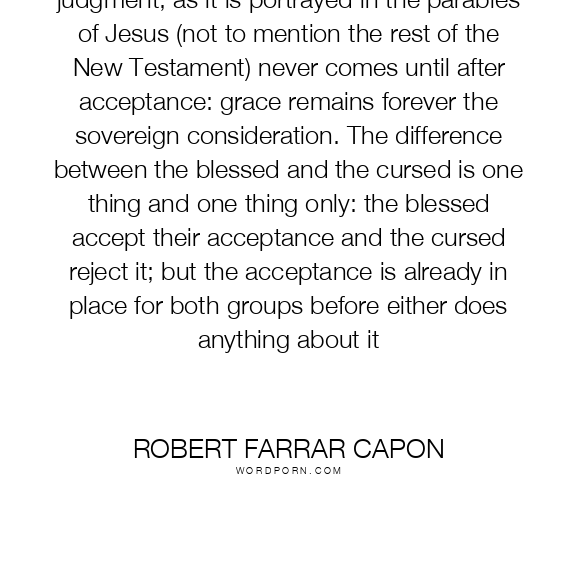 judgment, as it is portrayed in the parables of Jesus (not to mention the rest of the New Testament) never comes until after acceptance: grace remains forever the sovereign consideration. The difference between the blessed and the cursed is one thing and one thing only: the blessed accept their acceptance and the cursed reject it; but the acceptance is already in place for both groups before either does anything about it