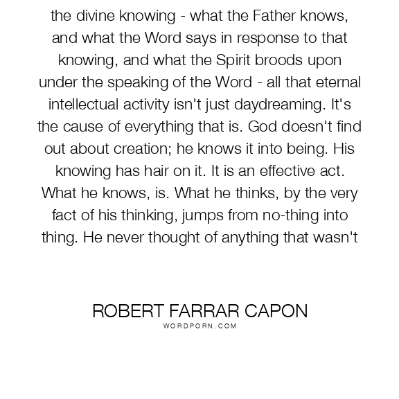 the divine knowing - what the Father knows, and what the Word says in response to that knowing, and what the Spirit broods upon under the speaking of the Word - all that eternal intellectual activity isn't just daydreaming. It's the cause of everything that is. God doesn't find out about creation; he knows it into being. His knowing has hair on it. It is an effective act. What he knows, is. What he thinks, by the very fact of his thinking, jumps from no-thing into thing. He never thought of anything that wasn't