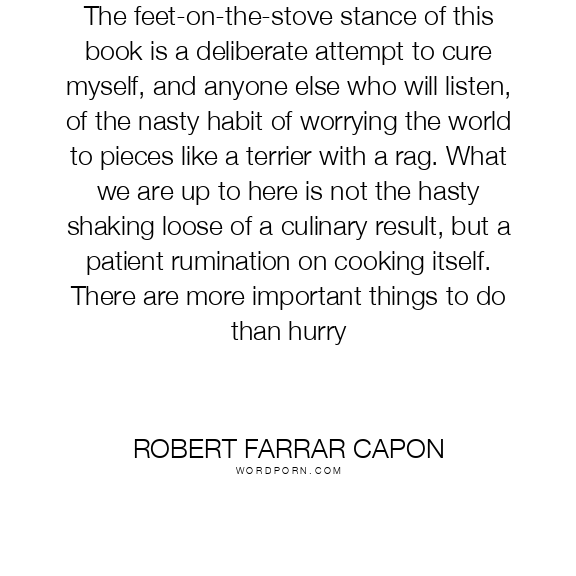 The feet-on-the-stove stance of this book is a deliberate attempt to cure myself, and anyone else who will listen, of the nasty habit of worrying the world to pieces like a terrier with a rag. What we are up to here is not the hasty shaking loose of a culinary result, but a patient rumination on cooking itself. There are more important things to do than hurry