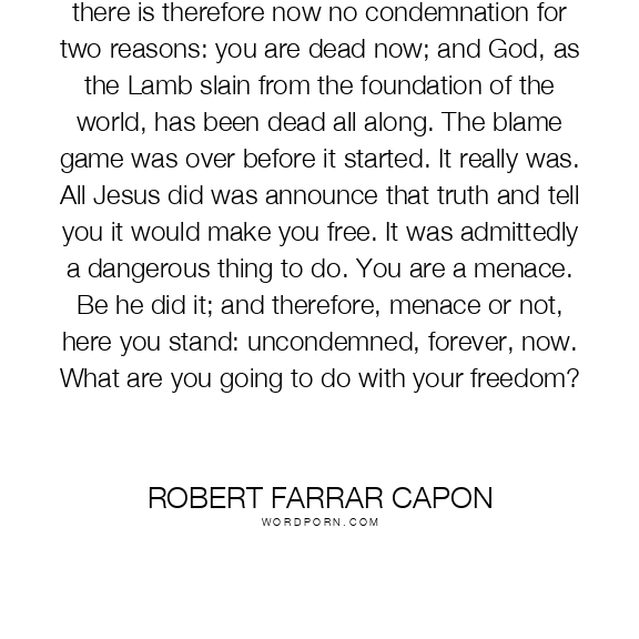 there is therefore now no condemnation for two reasons: you are dead now; and God, as the Lamb slain from the foundation of the world, has been dead all along. The blame game was over before it started. It really was. All Jesus did was announce that truth and tell you it would make you free. It was admittedly a dangerous thing to do. You are a menace. Be he did it; and therefore, menace or not, here you stand: uncondemned, forever, now. What are you going to do with your freedom?