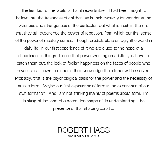 The first fact of the world is that it repeats itself. I had been taught to believe that the freshness of children lay in their capacity for wonder at the vividness and strangeness of the particular, but what is fresh in them is that they still experience the power of repetition, from which our first sense of the power of mastery comes. Though predictable is an ugly little world in daily life, in our first experience of it we are clued to the hope of a shapeliness in things. To see that power working on adults, you have to catch them out: the look of foolish happiness on the faces of people who have just sat down to dinner is their knowledge that dinner will be served. Probably, that is the psychological basis for the power and the necessity of artistic form...Maybe our first experience of form is the experience of our own formation...And I am not thinking mainly of poems about form; I’m thinking of the form of a poem, the shape of its understanding. The presence of that shaping constitutes the presence of poetry