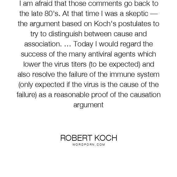 I am afraid that those comments go back to the late 80's. At that time I was a skeptic — the argument based on Koch's postulates to try to distinguish between cause and association. … Today I would regard the success of the many antiviral agents which lower the virus titers (to be expected) and also resolve the failure of the immune system (only expected if the virus is the cause of the failure) as a reasonable proof of the causation argument