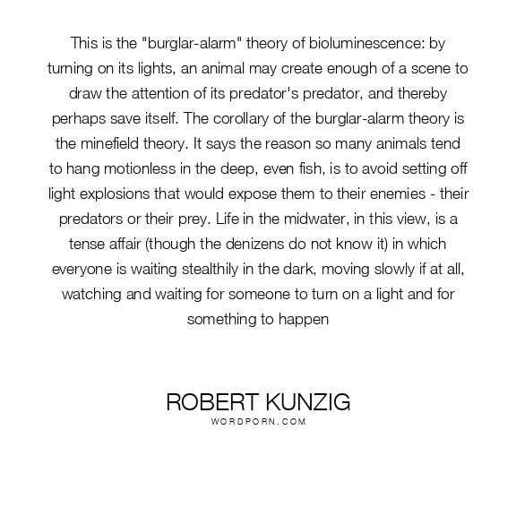 This is the "burglar-alarm" theory of bioluminescence: by turning on its lights, an animal may create enough of a scene to draw the attention of its predator's predator, and thereby perhaps save itself. The corollary of the burglar-alarm theory is the minefield theory. It says the reason so many animals tend to hang motionless in the deep, even fish, is to avoid setting off light explosions that would expose them to their enemies - their predators or their prey. Life in the midwater, in this view, is a tense affair (though the denizens do not know it) in which everyone is waiting stealthily in the dark, moving slowly if at all, watching and waiting for someone to turn on a light and for something to happen