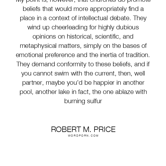My point is, however, that churches do promote beliefs that would more appropriately find a place in a context of intellectual debate. They wind up cheerleading for highly dubious opinions on historical, scientific, and metaphysical matters, simply on the bases of emotional preference and the inertia of tradition. They demand conformity to these beliefs, and if you cannot swim with the current, then, well partner, maybe you'd be happier in another pool, another lake in fact, the one ablaze with burning sulfur