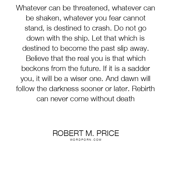 Whatever can be threatened, whatever can be shaken, whatever you fear cannot stand, is destined to crash. Do not go down with the ship. Let that which is destined to become the past slip away. Believe that the real you is that which beckons from the future. If it is a sadder you, it will be a wiser one. And dawn will follow the darkness sooner or later. Rebirth can never come without death