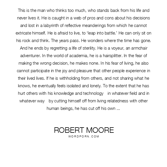This is the man who thinks too much, who stands back from his life and never lives it. He is caught in a web of pros and cons about his decisions and lost in a labyrinth of reflective meanderings from which he cannot extricate himself. He is afraid to live, to ‘leap into battle.’ He can only sit on his rock and think. The years pass. He wonders where the time has gone. And he ends by regretting a life of sterility. He is a voyeur, an armchair adventurer. In the world of academia, he is a hairsplitter. In the fear of making the wrong decision, he makes none. In his fear of living, he also cannot participate in the joy and pleasure that other people experience in their lived lives. If he is withholding from others, and not sharing what he knows, he eventually feels isolated and lonely. To the extent that he has hurt others with his knowledge and technology—in whatever field and in whatever way—by cutting himself off from living relatedness with other human beings, he has cut off his own soul