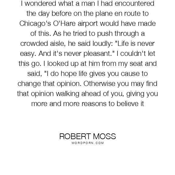 I wondered what a man I had encountered the day before on the plane en route to Chicago's O'Hare airport would have made of this. As he tried to push through a crowded aisle, he said loudly: "Life is never easy. And it's never pleasant." I couldn't let this go. I looked up at him from my seat and said, "I do hope life gives you cause to change that opinion. Otherwise you may find that opinion walking ahead of you, giving you more and more reasons to believe it