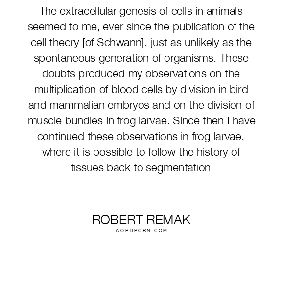 The extracellular genesis of cells in animals seemed to me, ever since the publication of the cell theory [of Schwann], just as unlikely as the spontaneous generation of organisms. These doubts produced my observations on the multiplication of blood cells by division in bird and mammalian embryos and on the division of muscle bundles in frog larvae. Since then I have continued these observations in frog larvae, where it is possible to follow the history of tissues back to segmentation